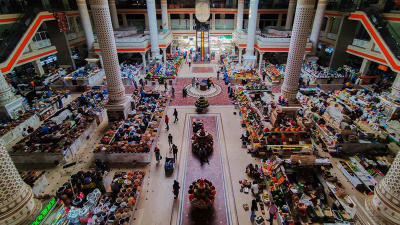 اگر به دنبال تجربهای واقعی و اصیل از خرید در دوشنبه هستید، بازار گرم (Green Bazaar) یکی از بهترین گزینههاست. این بازار سنتی یکی از قدیمیترین نقاط تجاری شهر محسوب میشود و در آن میتوانید به دنیایی رنگارنگ از ادویهجات، خشکبار، شیرینیهای محلی، میوههای تازه، چای، عسل طبیعی و صنایع دستی وارد شوید.