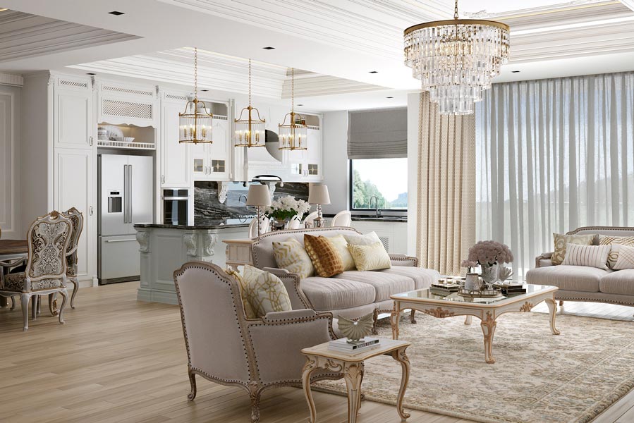 رنگبندی داخلی بر پایه سفید، بژ و آبی که حس آرامش مدیترانهای را القا میکند.